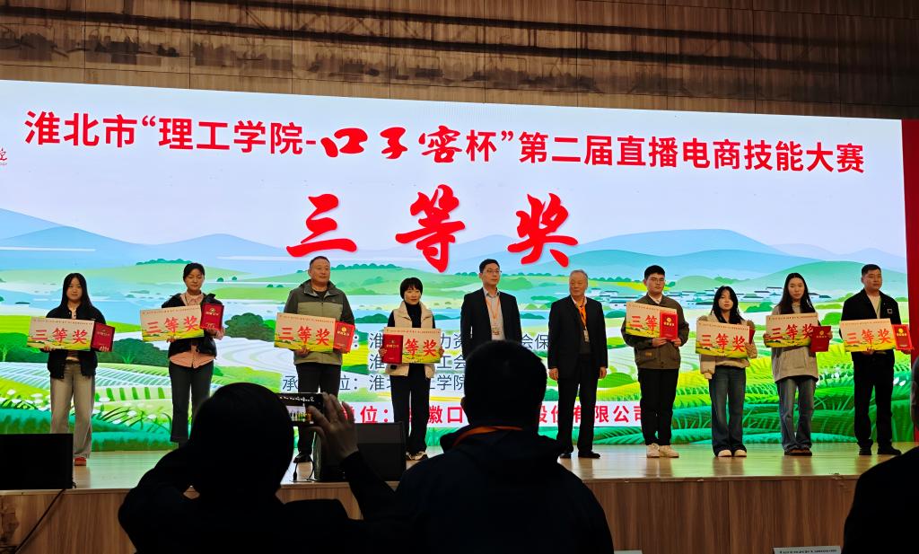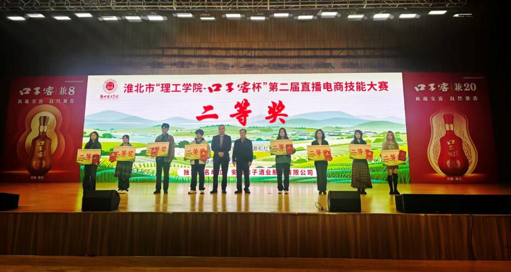 10月26日下午,淮北市“理工学院-口子窖杯”第二届直播电商技能大赛圆满落幕。beat365英国官网网站以陈志操、徐新荣为队长,六位教师分别组合成淮理一束光和锦年新升两个团队历经初赛选拔成功突围,晋级决赛,并在决赛中斩获二等奖、三等奖的好成绩。