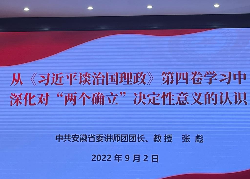 为贯彻落实习近平总书记在省部级主要领导干部专题研讨班上重要讲话精神,全省开展“举旗帜·送理论”省级示范宣讲活动。淮北市委宣传部邀请了中共安徽省委讲师团团长张彪教授于9月2日上午9时在市公安局报告厅作宣讲报告,张团长宣讲的主题为:从《习近平谈治国理政》第四卷学习中深化对“两个确立”决定性意义的认识。beat365英国官网网站刘奔前和孙澄澄老师作为入选的淮北市宣讲团成员,代表学校参加会议。