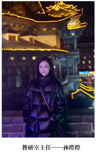 孙澄澄,女,中共党员,淮北市委宣讲团成员,纲要和毛概教研室教研室主任,硕士研究生,讲师。主要讲授《中国近现代史纲要》和《习近平新时代中国特色社会主义思想概论》课程,主持过多项省级科研和教研项目,在市级教学比赛中荣获过一等奖、三等奖,在校级教学比赛中多次获奖一等奖,连续几年获得校级“优秀教师”和“师德先进个人”称号。作为淮北市委宣讲团主要成员,至基层单位开展宣讲工作十多余次;指导学生参加比赛获得过片区赛和省级荣誉。